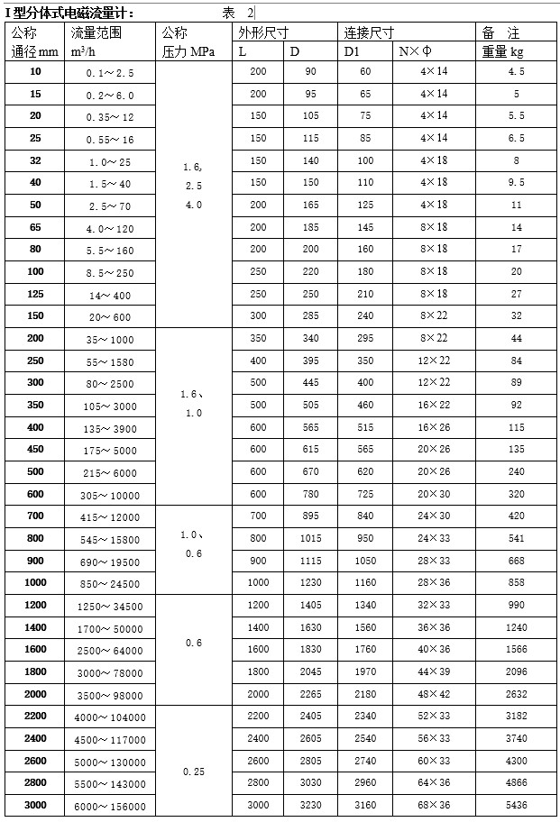 I型分體式電磁流量計(jì)口徑DN(mm): 10、15、20、25、32、40、50、65、80、