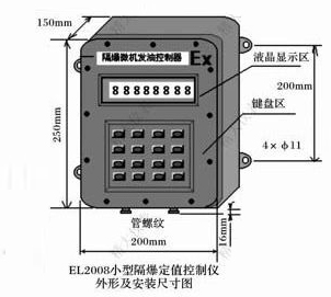 EL-2008隔爆批量控制器是一種新型的智能化隔爆定量控制儀表,它采用高性能微處理器,是一種真正的單片機(jī)系統(tǒng)。它采用背光式液晶顯示器顯示,不受光線(xiàn)的影響,結(jié)構(gòu)簡(jiǎn)單,可靠性高,可直接安裝于防爆操作現(xiàn)場(chǎng)、油罐車(chē)等需要現(xiàn)場(chǎng)防爆定量計(jì)量的場(chǎng)合。與各種脈沖輸出流量計(jì)配套可對(duì)流量進(jìn)行質(zhì)量或體積量的定量灌裝、計(jì)量和控制。該儀表可通過(guò)面板置入?yún)?shù),實(shí)施控制,具有斷電保護(hù)功能,是現(xiàn)代控制的理想單元儀 表。