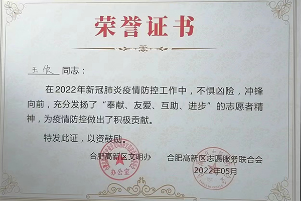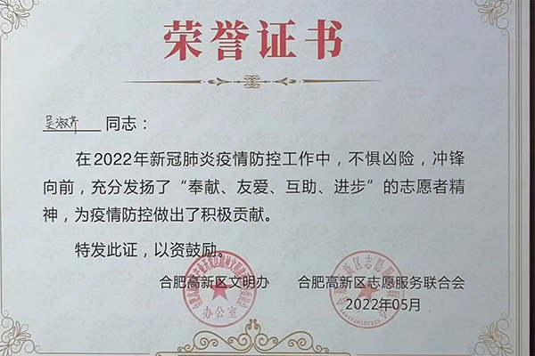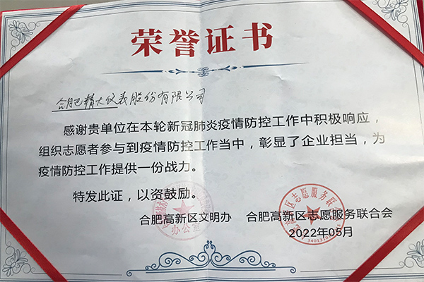 合肥精大儀表股份有限公司在新冠肺炎疫情防控工作中積極響應(yīng),組織志愿者參與到疫情防控工作中,彰顯了企業(yè)擔(dān)當(dāng),為疫情防控工作提供一份戰(zhàn)力。黨員王欣、吳淑芹二位同志在2022年新冠肺炎疫情防控工作中,不懼兇險(xiǎn),沖鋒向前,充分發(fā)揚(yáng)了“奉獻(xiàn)、友愛、互助、進(jìn)步”的志愿者精神,為疫情防控做了了積極的貢獻(xiàn)。公司和個(gè)人被高新區(qū)文明辦、和高新區(qū)志愿服務(wù)聯(lián)合會授予此榮譽(yù)證書。