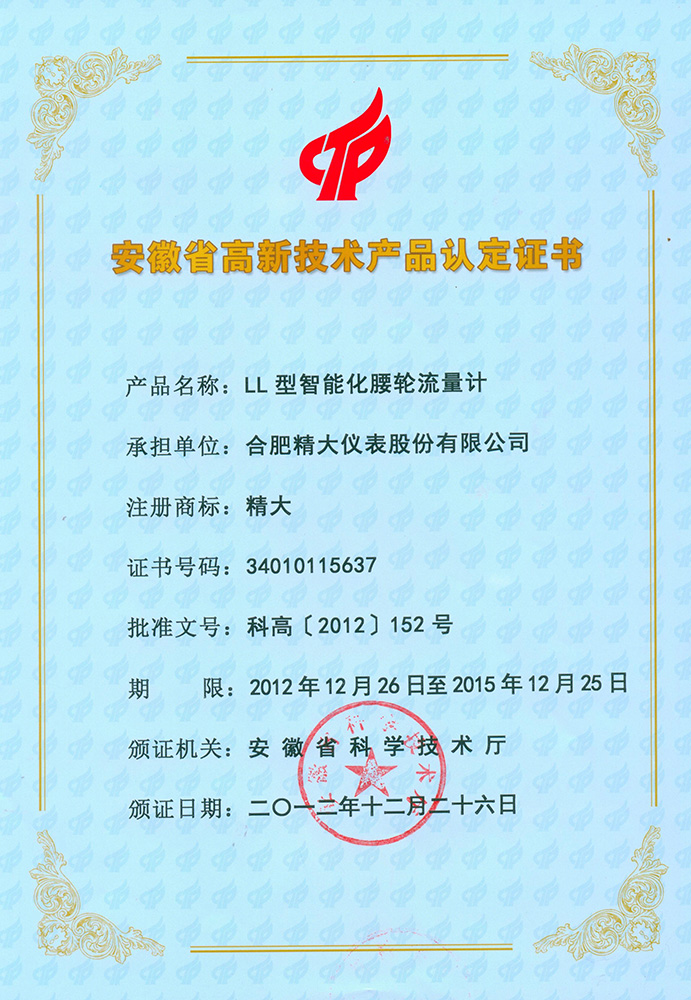 省高新技術(shù)產(chǎn)品認(rèn)定證書(shū)(LL型腰輪)
